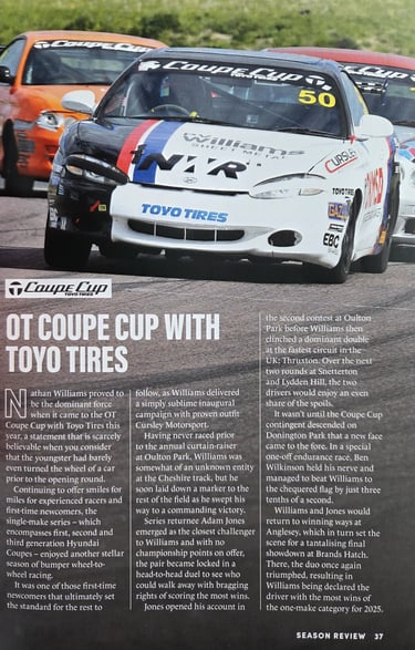 Great write up of Nathan's OT Coupe Cup Championship describing how "Williams delivered a simply sublime inaugural campaign..." having won the first race of the series at Oulton Park "Williams was somewhat of an unknown entity at the Cheshire track, but he soon laid down a marker to the rest of the field as he swept his way to a commanding victory.". Nathan went on to win a further 6 races including at the final race of the season at Brands Hatch where a final race win resulted in "Williams being declared the driver with the most wins in the one-make category for 2025"