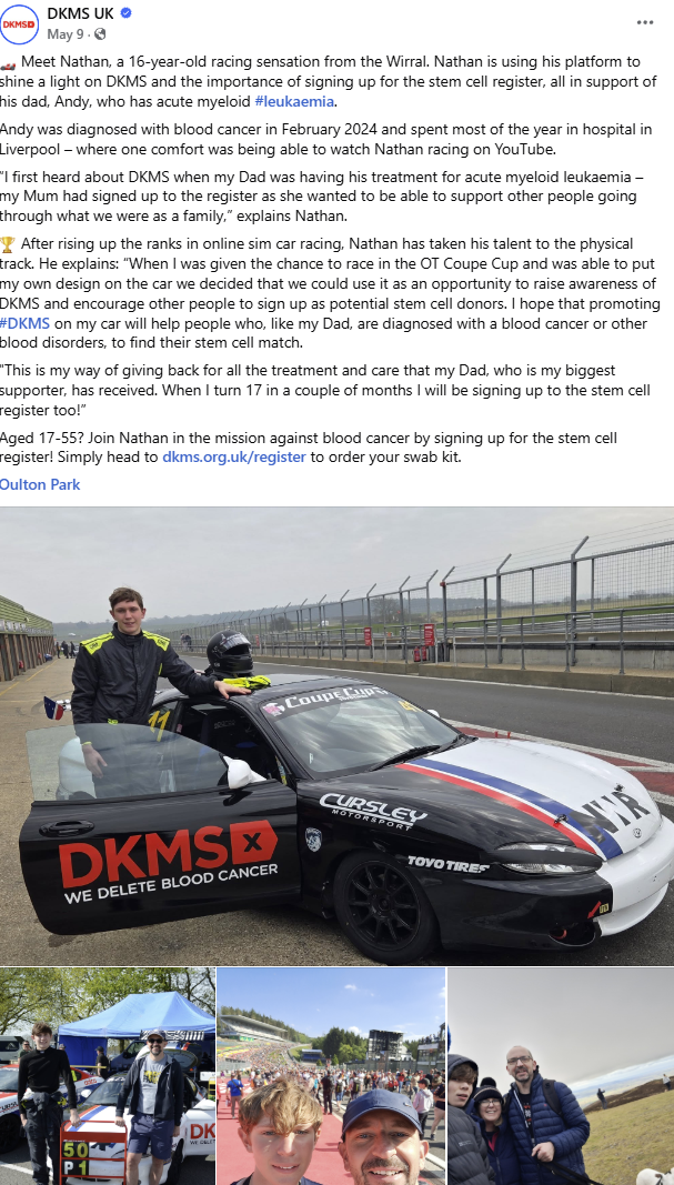 For the 2026 season we will continue to work with the stem cell charity DKMS to raise awareness of the stem cell register. Nathan will continue to promote DKMS with the logo appearing on his Legends Racing UK car. We are also planning on further media promotion and a donor drive at a circuit.