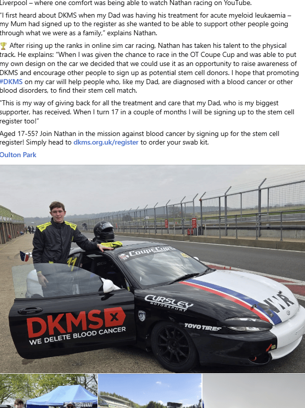 The Daily Mirror wrote an article about Nathan's racing and DKMS on the 5th August. It covered Nathan's dad's diagnosing with Leukemia and his planned Stem Cell Transplant. DKMS are attending Nathan's race at Donington on the 10th August which is part of the "Convoy in the Park" race weekend.